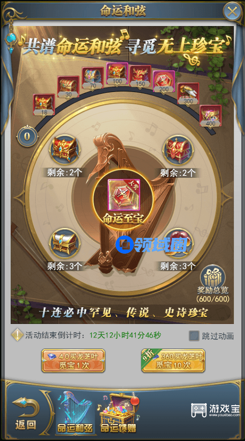 活动期间,可消耗“命运乐谱”或使用钻石购买龙芝叶进行觅宝,随机获得命运珍宝、罕见珍宝、传说珍宝、史诗珍宝4种品质的觅宝奖励;
