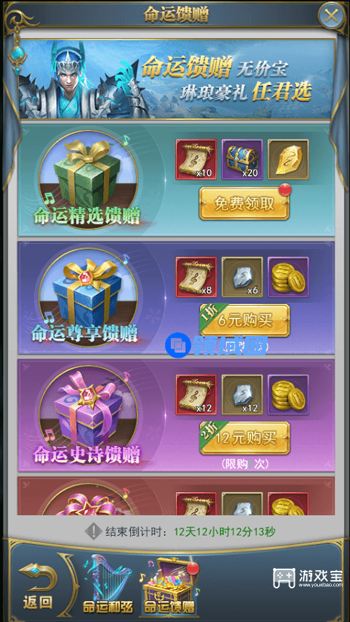 活动期间可购买命运馈赠礼包,助力命运和弦觅宝!每种礼包仅限购买一次,更有免费礼包可以领取,不要错过噢!