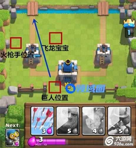 开局有巨人牌序:开始先等到十费再开始在基地后方投下巨人,当巨人移动到己方防御塔前面的时候在底线放下飞龙宝宝,当巨人踏上桥的时候在桥边放下火枪手视为一波完整的进攻。这边要注意留费用,不然全部放在一路另外一路会非常空虚,敌人很有可能王子+飞龙宝宝一波combo就打过来了。
