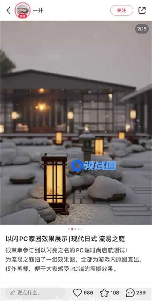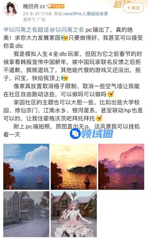 参与PC端测试的玩家纷纷晒出拍下的家园美景,有位玩家更是表示以闪的家园系统完全可以作为模拟人生的代餐,看得出对于以闪的家园系统确实很喜爱了。