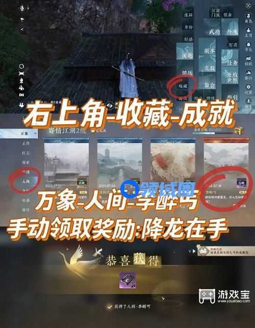 4、右上角-收藏-成就-万象-人间-李醉丐,手动领取奖励(降龙在手)。