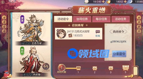 12、新区只用填密令拿奖励就行了,然后与一位老区的结义一起做任务拿奖励,老区需要有五个人填他的密令(一个账号只可填一个其他玩家密令)且与一位达成条件的玩家结义去拿奖励。老区的可以与其他玩家互换密令(不一定要回归号,只要让别的人花三分钟去新区创个号然后填密令就可以了)然后再去新区找别的人去填。一个账号只能填一次所以大家三思。