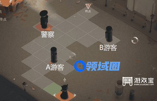 4、当我们到达以上图这个位置的时候我们就能直接挡住B游客前进的路线,导致游客无法前进这个时候我们直接走两步就到达重点了,这关就算过了一共用了17步。