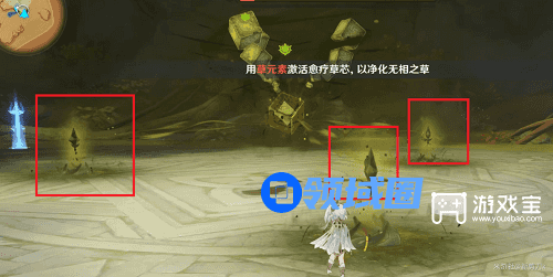 3、当无相草血量见底时,会放出三个草桩子,此时需要草元素净化它们,之后无相草开始读条。
