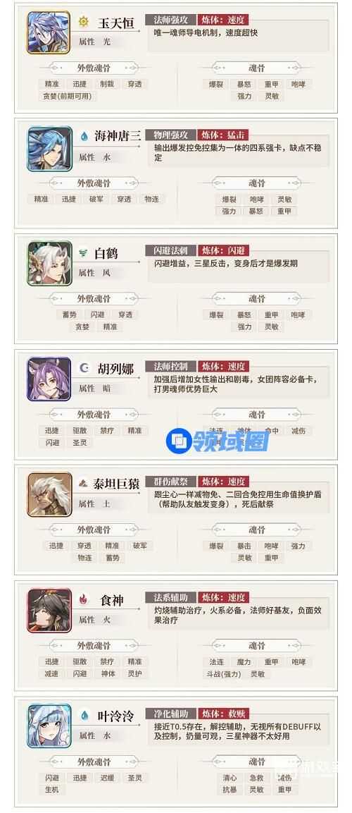1、同级别角色排名不分先后,自己队伍每个魂师所需要重叠最多的魂骨:神体迅捷(建议)。