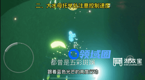 3、任务二里有几点需要注意,起步时不要跑太快可能会直接滑出球幕,走到蝴蝶罐子会有一大群水母过来,可以踩着水母向上飞也可以直接被水母拖上去,这里也是需要控制好速度,跟着蓝色光芒行动,如果飞的太高冲出球幕可能会有任务失败的风险。