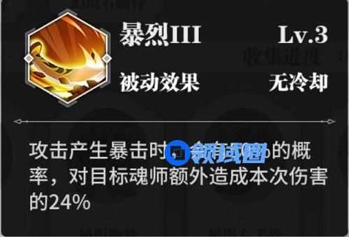 还有就是狂暴,增加魂师的暴击率,暴击率固然重要但是存在概率性问题,产生暴击就是有用,没产生暴击毫无作用。不过狂暴配合暴烈,可以使爆裂的攻击上限概率提升。