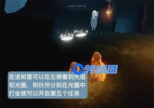 走进树屋可以在左侧看到先祖和光圈,和伙伴分别在光圈中打坐就可以开启第五个任务
