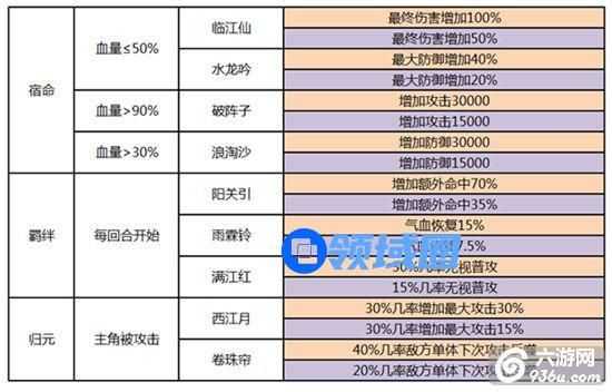 当前版本中,心法一共分为两个品级、三个门类,品级之分决定心法效果强弱,橙色心法为紫色心法的加强版。品级之外,心法亦可分为三大门类:宿命、羁绊、归 元,三种心法触发的条件不同,宿命心法与小主战斗回合前以血量为触发条件,满足即可释放;羁绊心法为回合开始时触发,其中阳关引和雨霖铃必释放,而满江红为几率触发;最后归元心法时主角被攻击时才会几率出现的心法,与满江红类似,都是最“看脸”的心法。