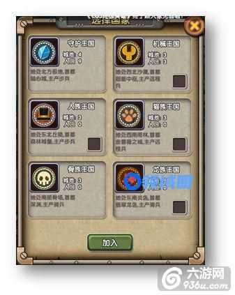 【分布】6个种族王国,军团长代表军团选择国家!【选国】军团前四不能选同一国家,战斗力最强国不能选!【初始】每个国家初始有1个主城,2个辅城,主城不能被攻打,也不能放置守军,其余为野城,可以攻打,如果攻城成功,会有防守军帮你守城哦!