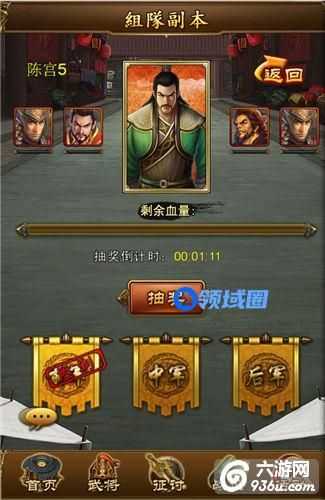 进入战场之后,首先显示副本BOSS信息,2秒之后自动跳转排兵布阵界面,队长要在60秒之内决定上场武将的阵容——此时正是队长发挥谋略才能之时!点击“直接开战”(这个名字谁起的哦,太没文化了,国小毕业的小编都看不下去了),进入战斗页面!对了,一路败退之后,队长还有60秒时间重新分配剩余武将~真心觉得任性化!