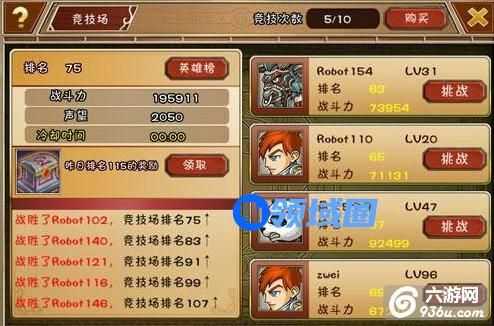 英雄榜:显示当前服务器竞技场排名前10的玩家信息。