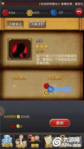 其中天赋推理是加攻击力的,天赋知识是加防御力的,提升天赋等级能够很好的提高战斗力。不过等级越高,消耗的金币越多。天赋等级升到50级后才可以天赋进阶了,进阶材料可以通过各个副本获得。天赋进阶后天赋等级降为1级,又要重新消耗大量金币提升等级,这个就是个巨大的吞金无底洞啊……