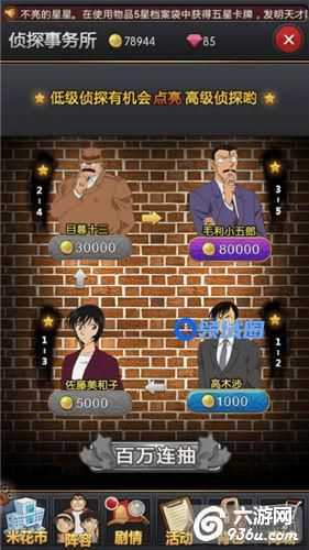 在侦探事务所抽卡可以通过金币与4个NPC交易获得卡牌,分别是高木涉(1000金币)、佐藤美和子(5000金币)、目暮十三(30000金币)、毛利小五郎(80000金币)。每次与低级侦探都有概率点亮高级侦探,点亮高级侦探毛利小五郎就有概率获得五星卡牌,当然,你也可以直接花150个钻石与毛利小五郎交易。小编觉得这个比活动里的基德彩蛋好多了,你只需要用金币,不需要花费钻石就有概率获得五星卡牌,如果你想直接花费钻石,一次彩蛋就可以点两次毛利小五郎,次数多了获得五星卡牌的概率自然就高了,所以是平民玩家的首选哦。