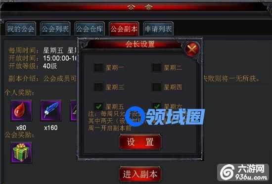 公会成员可以通过公会副本进入副本,副本时间由会长设置。但会长只能设置天数,开放时间为15:00~16:00。