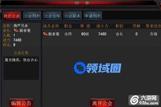 如果你已经加入了公会,打开公会界面之后会显示所在公会会员的详细情况,点击底下的“公会列表”按钮可以查看服务器内其他公会情况;点击“离开公会”即可单飞。