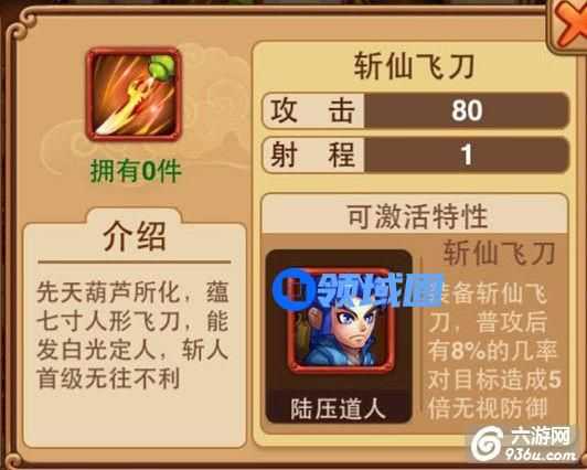 斩仙飞刀,在《全民西游2》中属于史诗武器,是陆压道人的专属武器,装备之后,陆压道人普攻后有8%的几率对目标造成5倍无视防御,获得途径可以通过云游仙商,获得以及故事关卡。