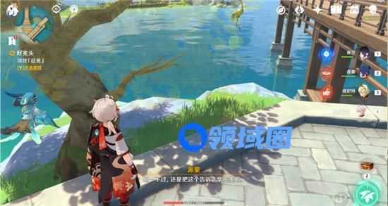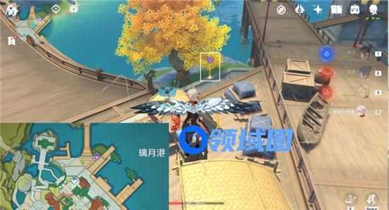 1、玩家需要前往璃月港的传送锚点,然后去往北边位置的码头,然后找到一颗树,如下图所示位置。
