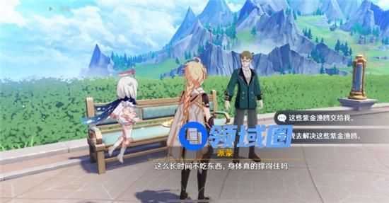 1、玩家需要前往枫丹廷沫芒宫后面的花园椅子处,之后需找到艾尤恩对话,从中得知艾尤恩对工作的抱怨,以及他的食物被紫金渔鸥抢走了。