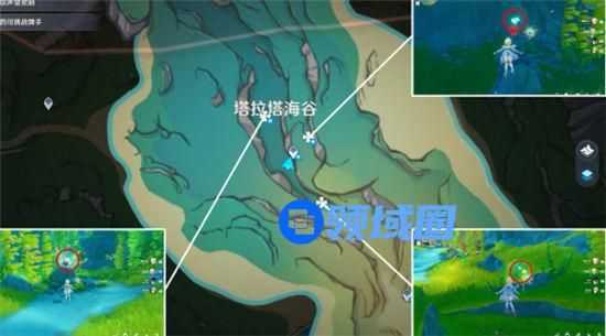 1、拉塔海谷水神瞳一共有4个,收集位置如下图所示,玩家可以利用传送锚点快速到达水神瞳附近的位置;