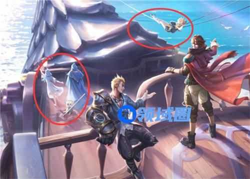 2、早在莱西奥的开航海报上就有这位新英雄的背影,下图左侧红圈内少女就是人鱼公主了,另一位英雄可能是八神庵。