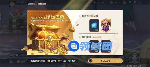 一个月卡30RMB,且没有其他挡位,购买之后每日可领取100金币和50体力值(用于工厂升级)
