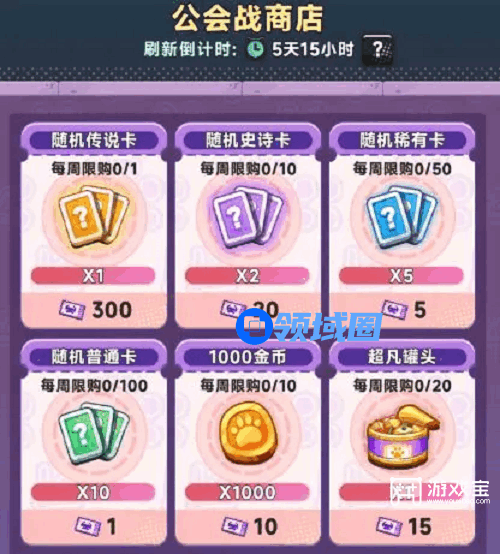 公会奖券:公会奖券可以兑换金、紫、蓝、绿卡,金币,罐头和换卡币,推荐新手每周换满1w金币(金币很重要!金币很重要!金币很重要!),其次是随机金卡,其他可以不考虑换取,同时奖券的获取公式为:每周个人获得奖券=所在公会排名*个人伤害系数排名,所以并不是去排名越高的公会越好,大家可以自行计算一下收益。