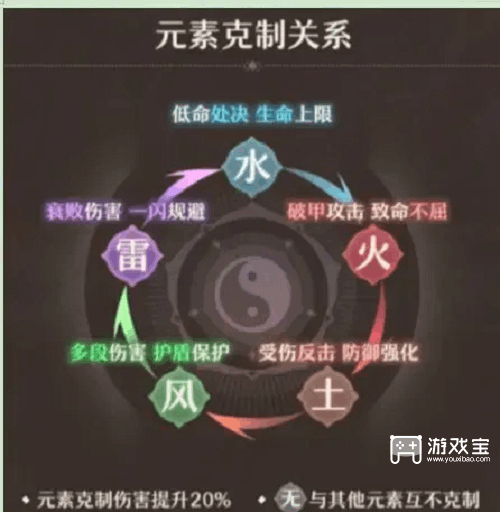 1、元素克制:本作的元素之间的相互克制利用好可以让你反败为胜,元素克制不仅有额外伤害提升,不同元素之间还有不同效果。这里注意:无元素与其他的元素之间不存在克制关系~打出来相当于直接伤害。