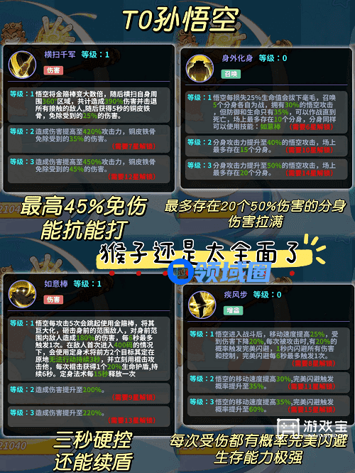 悟空:通过分身和定身术增强队伍的生存和输出能力。