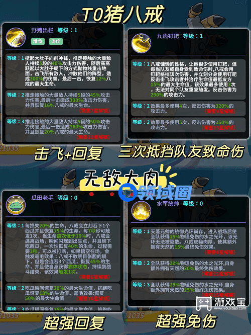 八戒:坦克角色,提供高额物理免伤和生命恢复能力。