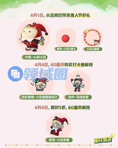 4月4日可以花60蛋币购买打卡手册,解锁小丑的表情及动作,还有一款小丑手偶的配饰。