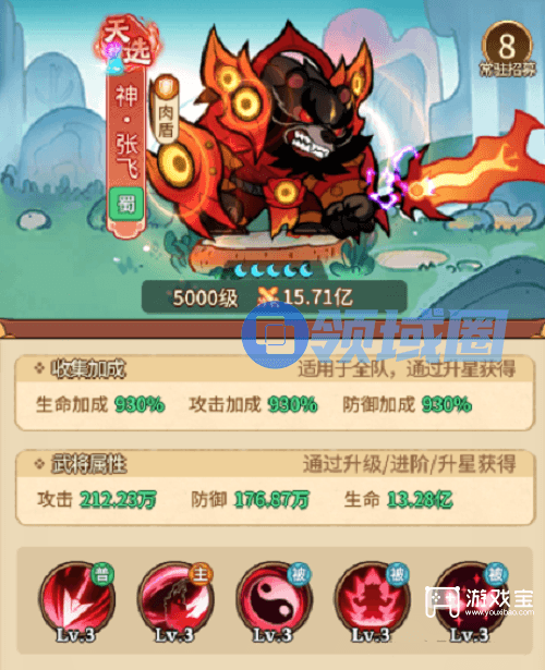 ⑤ 被动技【神盾】:战斗开始为己方全体增加神张飞生命上限15%(+7.5%)的护盾,化身丈八蛇矛形态时再次增加护盾,均持续10秒