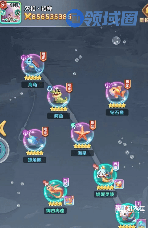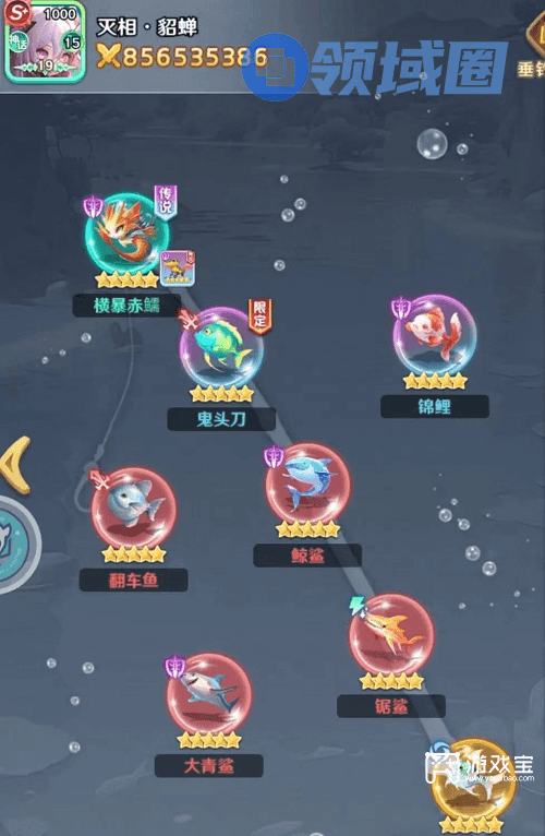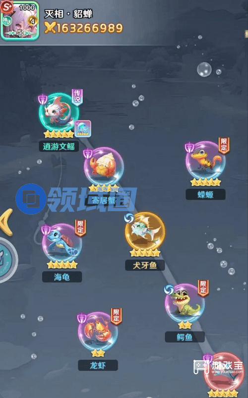 低配神话貂蝉的鱼搭配如上图,水母、蝾螈、海龟、龙虾这4条还是必带的,有4星以上传说鱼文鳐的可以带寄居蟹配合触发不屈。
