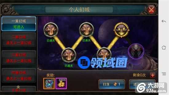 个人幻域没什么好说的,大家可以理解为另一个元素试炼副本,无论是难度,还是怪物模式,奖励模式,基本都是一样,只不过是把两种进阶石头换成了涅魔符和诅咒石,每一重幻域有5个小关和1个BOSS关,小关奖励涅魔符,BOSS关则增加了诅咒石的奖励,每天只可以免费挑战3次,再想挑战就需要花钻石了,这个不建议大家用钻石,收益太低。