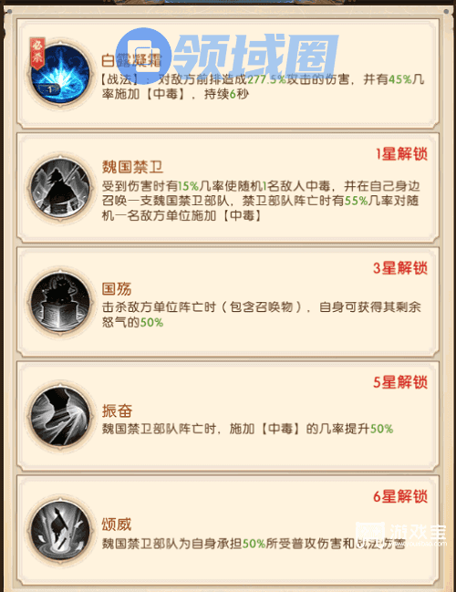 3、曹丕是队伍的核心,拥有关键的放毒技能,能主动为敌方施加【中毒】效果;同时曹丕还能召唤魏国禁卫军队,一定概率施加【中毒】。曹丕可通过推进主线任务,解锁7城时自选,解锁16城时可再次自选升星。