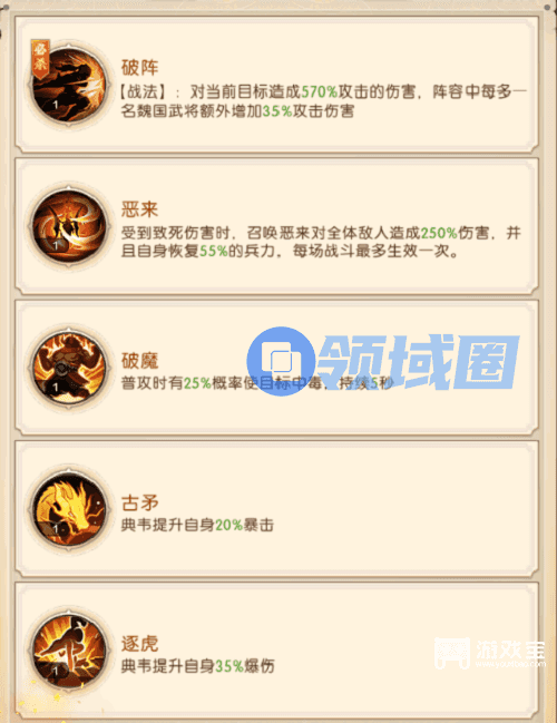2、魏国阵营前期围绕【中毒】与【召唤物】的特性进行组建,通过【中毒】与【召唤物】使魏国武将的技能产生联动。前期魏国推荐阵容的组成为:曹仁/典韦、曹丕、蔡文姬、张辽、夏侯渊。