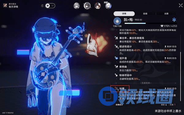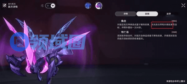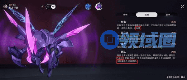 纠缠:行动延后,下个回合开始时受到量子属性附加伤害。纠缠状态下的目标每次受到攻击后,都会使该附加伤害提高,该效果最多叠加5层。