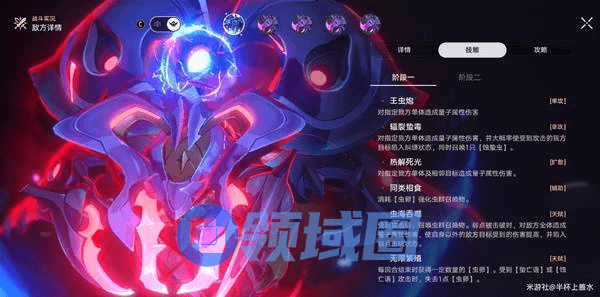 受到攻击后,召唤虫群召唤物(二阶段每次两只)。弱点被击破时,对敌方全体造成量子属性伤害,使自身以外的敌方目标受到的伤害提高,并陷入弱点击破状态。