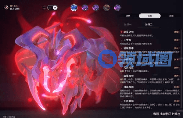 受到攻击后,召唤虫群召唤物(一阶段每次一只)。弱点被击破时,对敌方全体造成量子属性伤害,使自身以外的敌方目标受到的伤害提高,并陷入弱点击破状态。