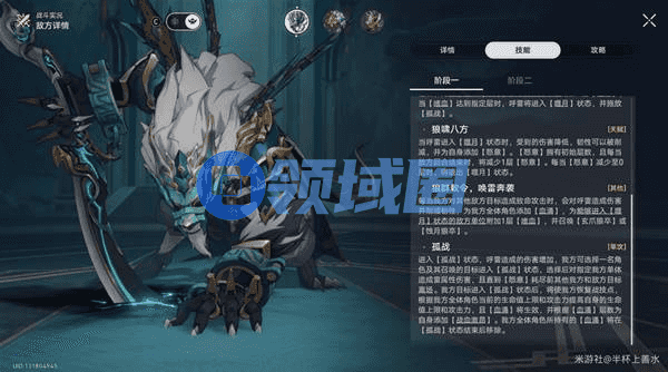 2、快速击杀召唤的狼卒:击杀狼卒可以给我方叠加【血涌】并且削韧呼雷(锁定弱点期间也能削减),【孤战】状态可以提升我方角色属性值,狼卒会一直刷新;