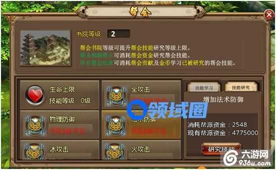 帮会技能分为可被研究的帮会技能和不可被研究的帮会技能,可被研究的帮会技能为当前帮会书院等级内可被研究的帮会技能,此类帮会技能无加锁标志,此类技能被选中时,右侧显示其技能信息。不可被研究技能为需提升书院等级才可研究的帮会技能,此类技能有加锁标志,技能图标右侧下方显示技能开启所需的书院等级,文字描述为:书院3级开启(此处文字描述标红),选中此类技能时,右侧显示该技能效果描述,已帮会技能法术防御为例,文字描述为:增加法术防御。