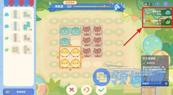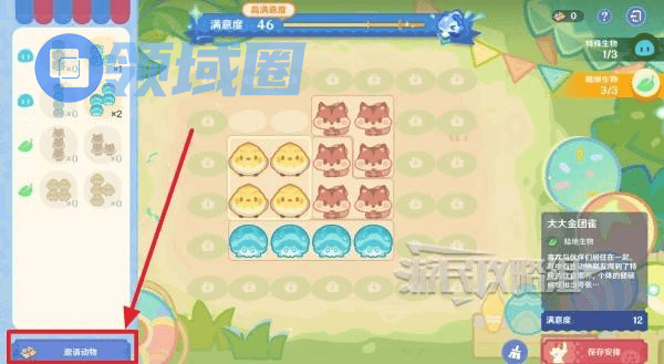 解锁【悠悠慢庄园】,邀请并安排动物,参考下图,优先安排同类的生物以激活特殊效果。