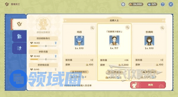 在聘用员工方面,选择满级的员工可以解燃眉之急,如果没有选择培养消耗降低的料理,可以临时雇佣满级员工来应急,如果有培养消耗降低的料理,可以考虑聘用Lv1的员工,之后在料理效果内将其培养至高等级。
