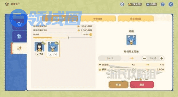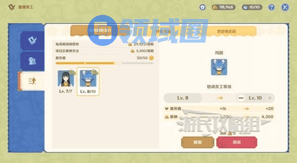 然后升级设施,笔者这里升级了【悠悠慢庄园】和【缤纷蹈险奇行】。所以需要为这两处设施搭配新的员工,并且将员工培养至满足下一个服务阶段。