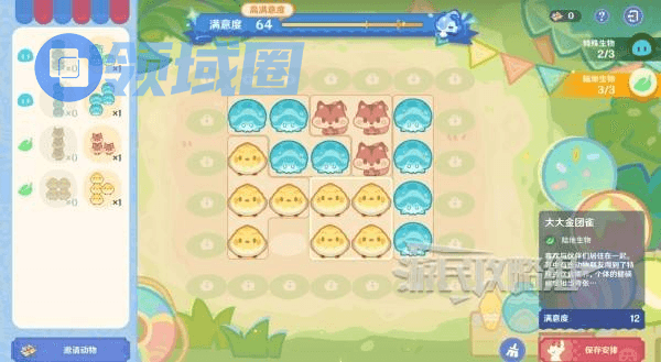 重新调整【悠悠慢庄园】生物满意度。有空格子放不满就换成占格子多的,优先考虑触发同类生物效果,然后是用占格子较多的块把空格子占满,这样能提升满意度。