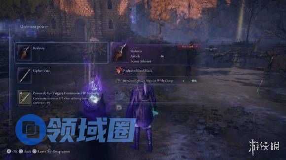 在城堡外悬崖处与两个商人交谈,购买蓝色锻造石,将起始武器升级至紫色(使用蓝色+紫色锻造石)。