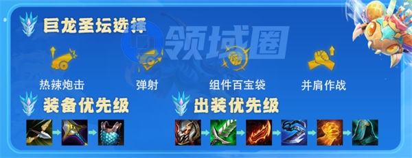 圣龙符文方面热辣炮击(增伤)、弹射(增伤)、并肩作战(增伤)、组件百宝袋这几个最优。
