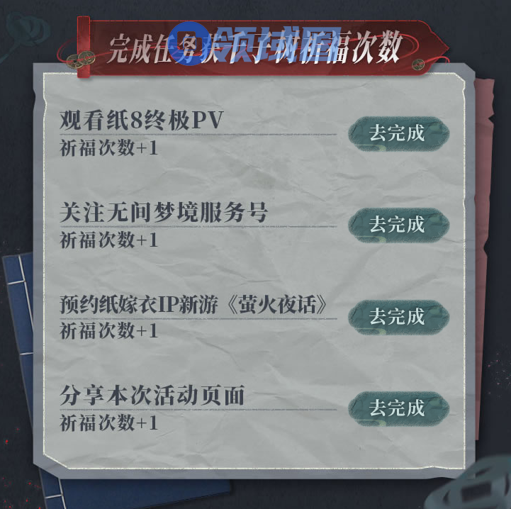 2、活动期间预约纸嫁衣8即可获得一次抽奖机会;完成页面任务后每个用户共计可获得四次抽奖机会