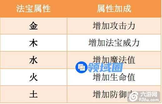 目前,法宝的属性分为5类:分别为金、木、水、火、土。