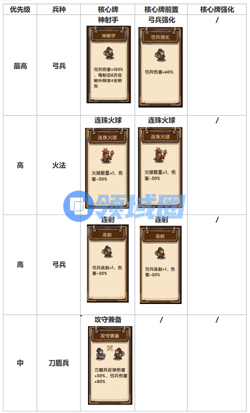 优先铺满兵种,弓兵>火法师>刀盾>其他,后续的核心牌按如下顺序推荐选择